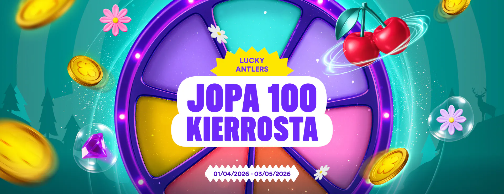 Voimassa: 1.4.2026–3.5.2026. Maks. 20 kierrosta per asiakas per päivä. 1 kierros jokaista 5 € talletusta kohden. Palkinnot 1 - 100 kierrätysvapaata kierrosta, arvo 0,10 € kukin. Ilmaiskierrokset vanhenevat 48 t. Kuluttua. 18+ & vain Suomessa asuvat pelaajat. Säännöt voimassa • GamblingTherapy.org • Säännöt ja käyttöehdot