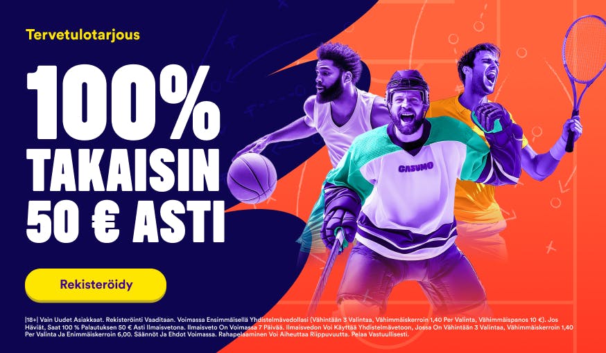 |18+| Vain uudet asiakkaat. Rekisteröinti vaaditaan. Voimassa ensimmäisellä yhdistelmävedollasi (vähintään 3 valintaa, vähimmäiskerroin 1,40 per valinta, vähimmäispanos 10 €). Jos häviät, saat 100 % palautuksen 50 € asti ilmaisvetona. Ilmaisveto on voimassa 7 päivää. Ilmaisvedon voi käyttää yhdistelmävetoon, jossa on vähintään 3 valintaa, vähimmäiskerroin 1,40 per valinta ja enimmäiskerroin 6,00. Säännöt ja ehdot voimassa. Rahapelaaminen voi aiheuttaa riippuvuutta. Pelaa vastuullisesti.